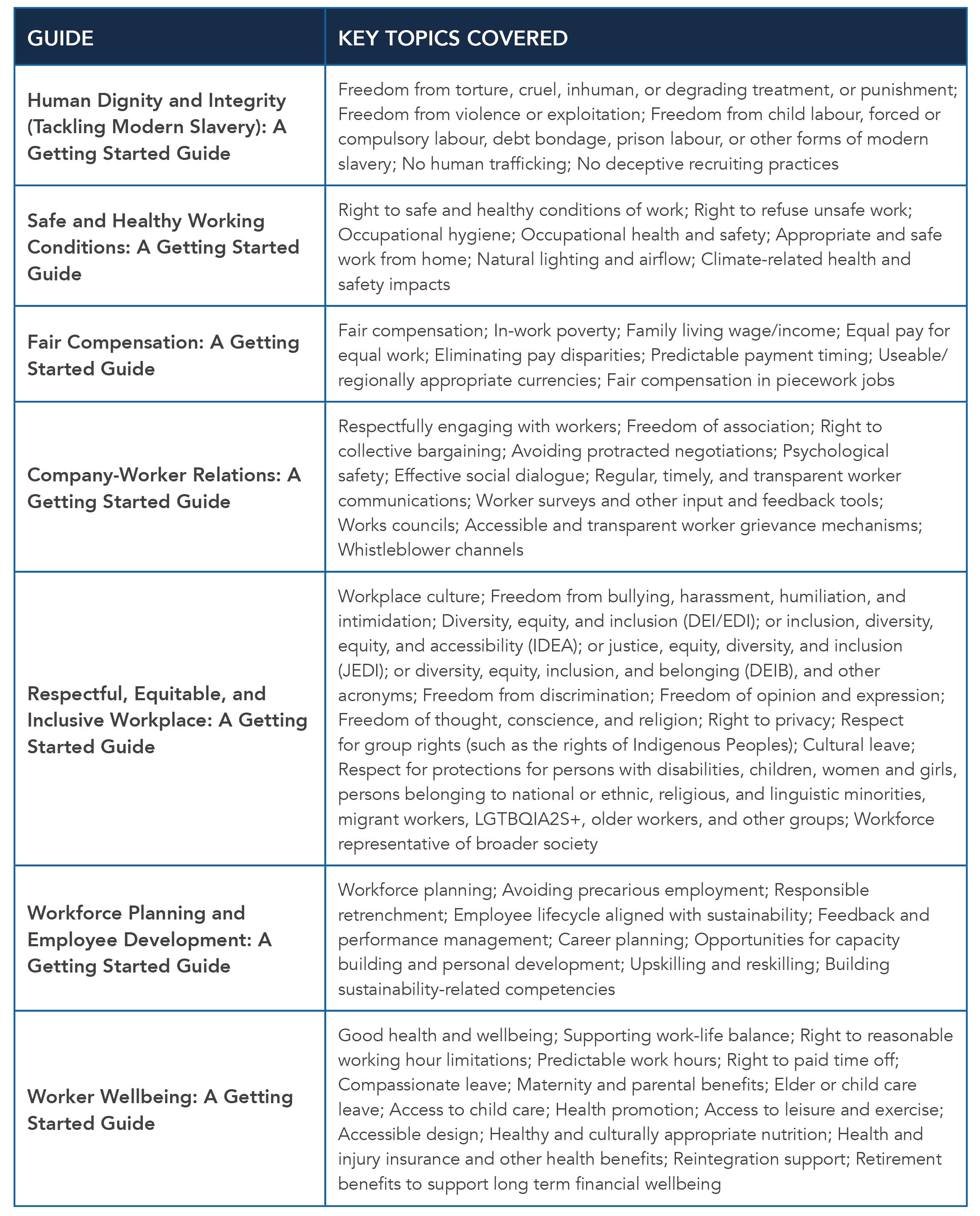 For detailed guidance related to any of the key topics, we encourage you to explore the relevant Getting Started Guide on Rights and Wellbeing at Work.
