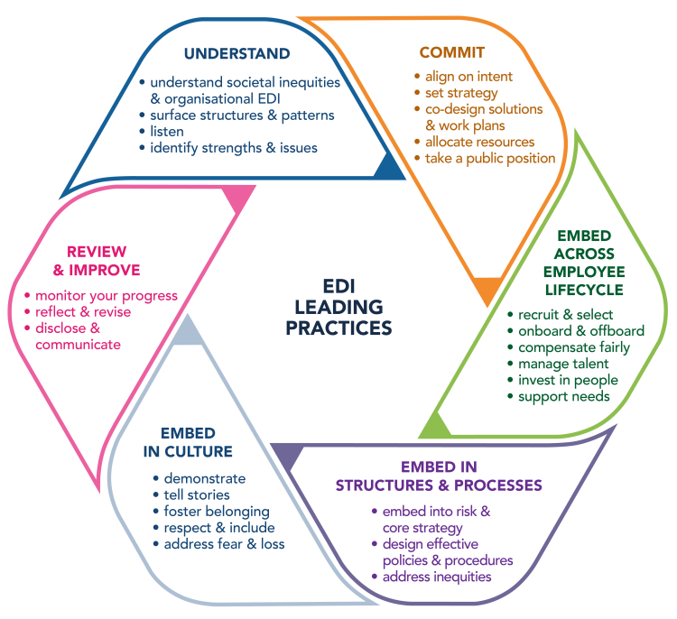 It's important to remember that there are no one-size-fits-all solutions for EDI programs. This journey will look different in each organisation. Mould these practices to fit your organisational context – take the time to understand your organisation and assess what would be most helpful for driving change in your workplace.